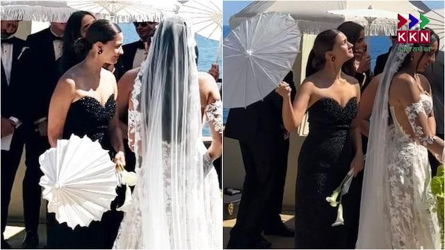 At the elegant white wedding ceremony, Alia donned a sleek, strapless black gown that exuded sophistication. Her ensemble was complemented by minimalist accessories, including black studded earrings, a chic white parasol, and a delicate bouquet of white flowers. With her hair styled in a neat bun, Alia stood gracefully among the bridesmaids, embodying timeless charm.